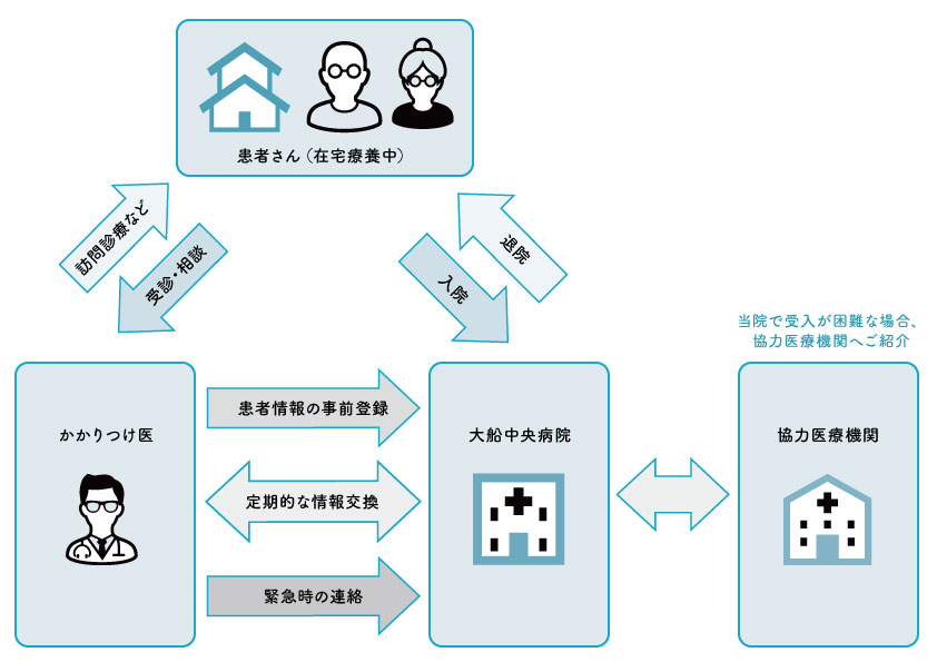 自宅や高齢者施設で療養されている患者さんやご家族が安心して過ごせるように、在宅医療を提供するかかりつけ医と大船中央病院が連携して診療を行います。