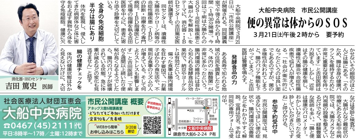 3月21日(土)午後2時より、消化器・IBDセンター 吉田医師による市民公開講座「下痢は大腸からのSOS ~炎症性腸疾患と大腸がんを解説~」を当院で開催いたします。